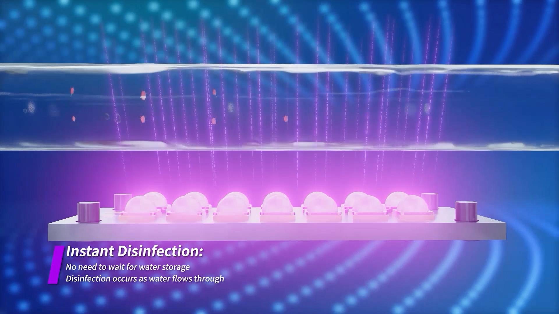 Mercury-free UVC LEDs (270-280nm wavelength). Disinfection rate up to 99.999% or 5.0 log. (Actual performance may vary depending on water quality)